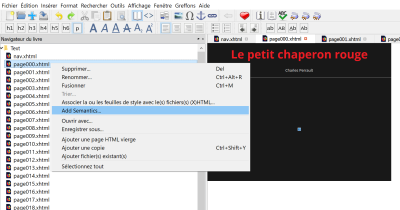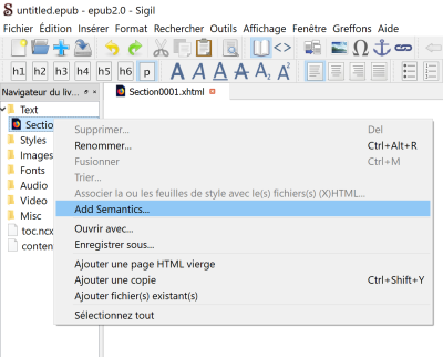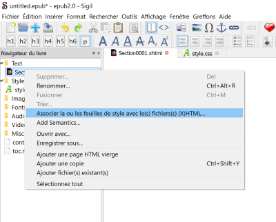 Une fois la feuille de style chargée dans Sigil, il va falloir associer une page xhtml à une feuille de style pour que la mise en forme s'applique à la page :